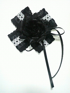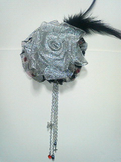 ・シルバーのリボンで編んだ薔薇のコサージュ