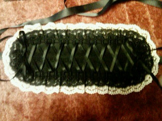 十字架のモチーフレースを外周にあしらい、黒のサテンリボンで飾りました。