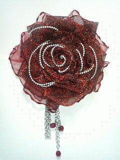 ・ボルドーカラーのリボンで編んだ薔薇のコサージュ